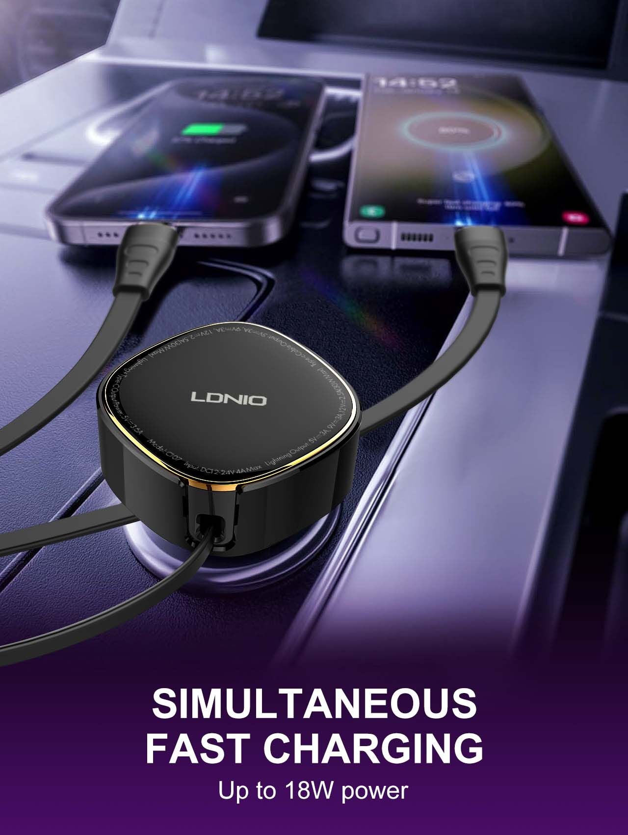 - The LDNIO C107 is a compact and efficient 30W fast car charger designed for users who value convenience and versatility on the go. Featuring a built-in retractable 2-in-1 charging cable, it supports both USB-C and Lightning connectors, allowing seamless charging for a wide range of devices including iPhones, Android smartphones, tablets, and more. The retractable design keeps cables tidy and eliminates the need to carry extra charging accessories in your vehicle.